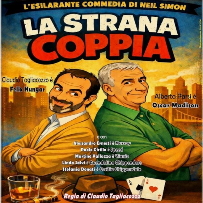 La più celebre commedia di Neil Simon “La Strana Coppia” è ambientata a New York negli anni sessanta: due divorziati, Felix e Oscar, diversi in tutto e per tutto, dividono un appartamento e si scontrano con i problemi di convivenza quotidiana, dando vita a continue ed esilaranti gag di spassoso e sano divertimento. Ne La strana coppia il più geniale e prolifico autore del teatro comico della seconda metà del '900 ci narra della difficile e alquanto complicata convivenza tra due uomini diametralmente opposti, offrendoci l'occasione per riflettere sulle fragilità e sulle nevrosi "metropolitane" dell'animo umano e soffermandosi ironicamente sulla "middle class" americana. Su questa diversità d’Essere si basa la regia dello spettacolo, al fine di far uscire in pieno le intenzioni del geniale autore. Mai come in questo testo alcune battute di classico humour anglosassone sono semplicemente acutissime e mostruosamente ironiche, assicurando agli spettatori due ore di grande divertimento.